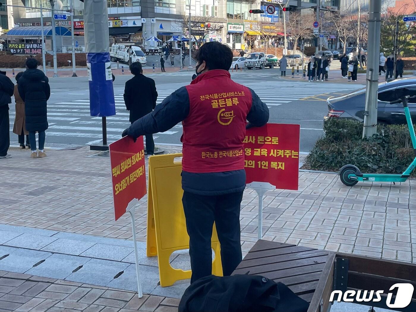 노조 “역대급 매출에도 성과금 동결”사측 “협상 가능성은 언제나 열려있어” 19일 오후12시께 부산 센텀시티에 위치한 골든블루 센텀 사무소 앞에서 노조원이 1인 시위를 하고 있다.2023.01.25. ⓒ News1 강승우 기자