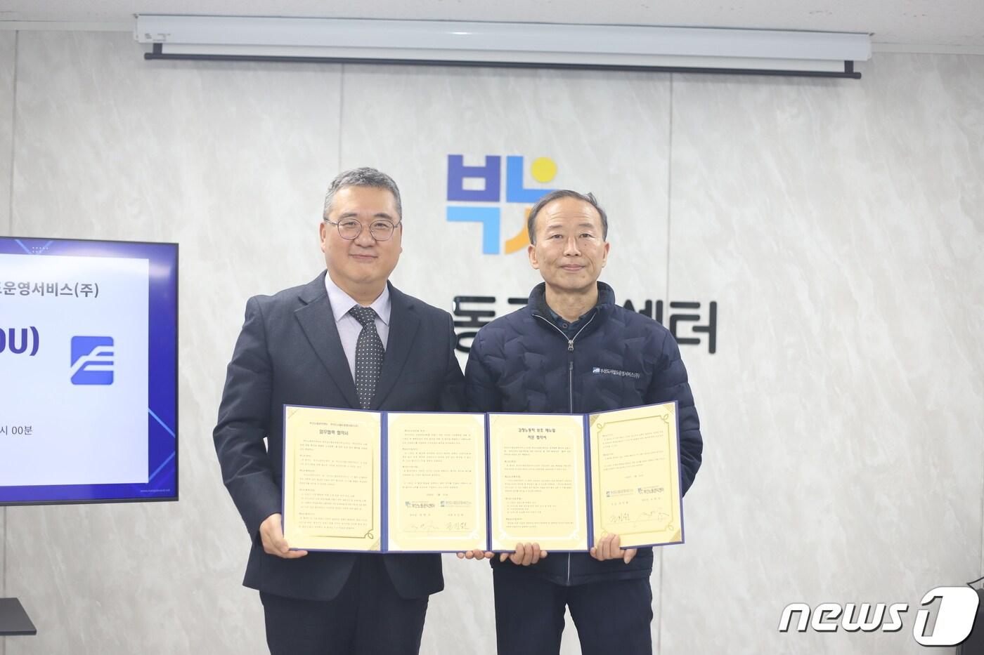 지난 21일 부산 부산진구 부산노동권익센터에서 열린 업무협약식에서 석병수 부산노동권익센터장(왼쪽)과 조진원 부산도시철도운영서비스 사장이 기념 촬영을 하고 있다.(부산노동권익센터 제공)관련 키워드감정노동자부산노동권익센터부산도시철도운영서비스