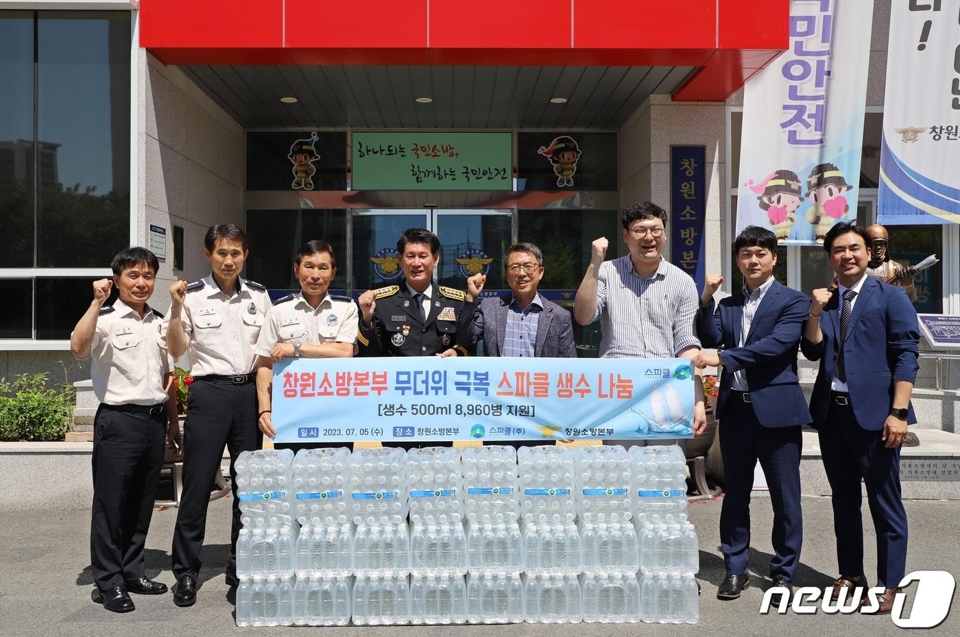 지난 5일 스파클㈜ 관계자들이 경남 창원소방본부를 찾아 생수 8960병을 전달하고 기념촬영을 하고 있다.(창원소방본부 제공)