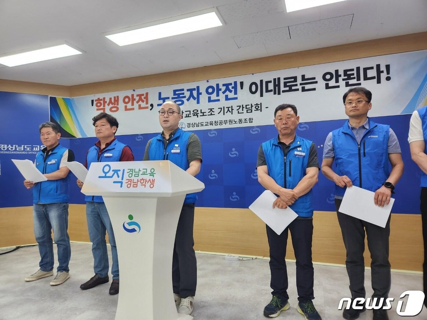 급식실 산업안전보건 담당자로 영양교사·보건교사 지정 촉구박종훈 교육감 산업안전보건업무 배심원단 주장에 "눈치보기"경남교육청 공무원노조가 12일 교육청 브리핑룸에서 학교 내 안전 문제 해결을 위한 기자간담회를 진행하고 있다.(/뉴스1 박종완 기자)관련 키워드산업안전보건법급식실담당자박종완기자관련 기사울산교육청, 12월까지 위험성 평가·근골격계 유해 요인 조사