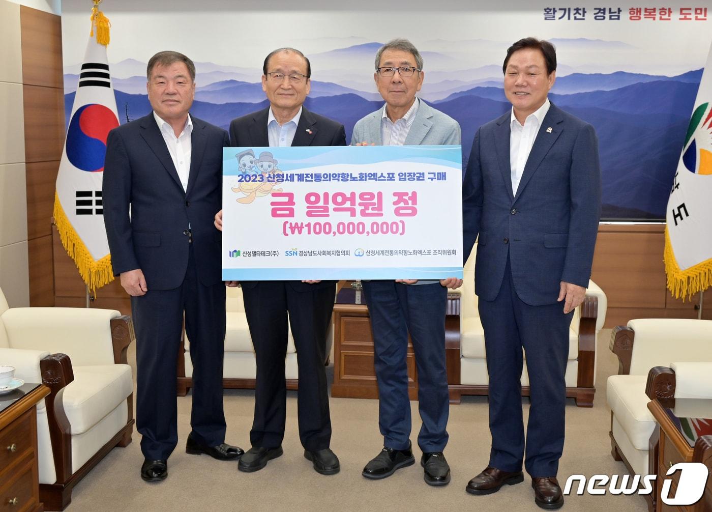 엑스포 성공 개최 위한 입장권 1억원 구매 약정 체결소외계층 위해 경남사회복지협에 입장권 1만매 기탁이승화 산청군수, 박성욱 경남사회복지협의회장, 구자천 신성델타테크 회장, 박완수 경남지사(왼쪽부터)가 21일 경남도청에서 산청엑스포 입장권 구매약정을 체결하고 기념사진을 찍고 있다.(경남도 제공)관련 키워드신성델타테크산청엑스포입장권구매강정태 기자 '층간소음 시비' 이웃에 흉기 휘두른 40대 실형김미나 창원시의원 '이태원 참사 유족 모욕' 최초 보도한 기자 불송치