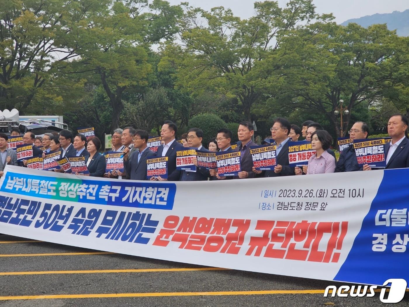 "남부내륙철도 건설 사업 정상추진" 촉구 "재검토시 2027년 개통 불투명…박완수 추진 요청 해야"더불어민주당 경남도당이 26일 경남도청 앞에서 기자회견을 열고 남부내륙철도 사업의 정상 추진을 촉구하고 있다. 2023.9.26 ⓒ 뉴스1 박민석 기자관련 키워드더불어민주당 경남도당남부내륙철도기재부국토부김두관박완수