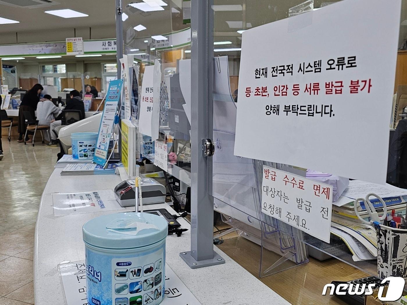 "9시부터 멈춰, 행안부 전산망 사용업무 중단"17일 창원시 성산구 용지동 행정복지센터에 민원 서류 발급이 불가하다는 안내문이 붙어있다. 2023.11.17 ⓒ 뉴스1 박민석 기자관련 키워드경남경남도경남 18개 시·군행정 전산망 오류행정복지센터 마비창원용지동창원시 주민등록초본관련 기사박종훈 경남교육감 "남은 임기 경남교육 방향 흔들림 없게 기반 다질 것"경남도, 도내 번화가 '수능 인파 대비' 안전관리 체계 가동"도민 자부심·열정, 경남 발전의 힘"…제42회 도민의날 기념식경남 4개 군, 소아청소년과 의원 '전무'…전문의도 전국 5.54% 수준경남도 '소비쿠폰 신청 첫날' 32만 6601건 접수…774억원 지급