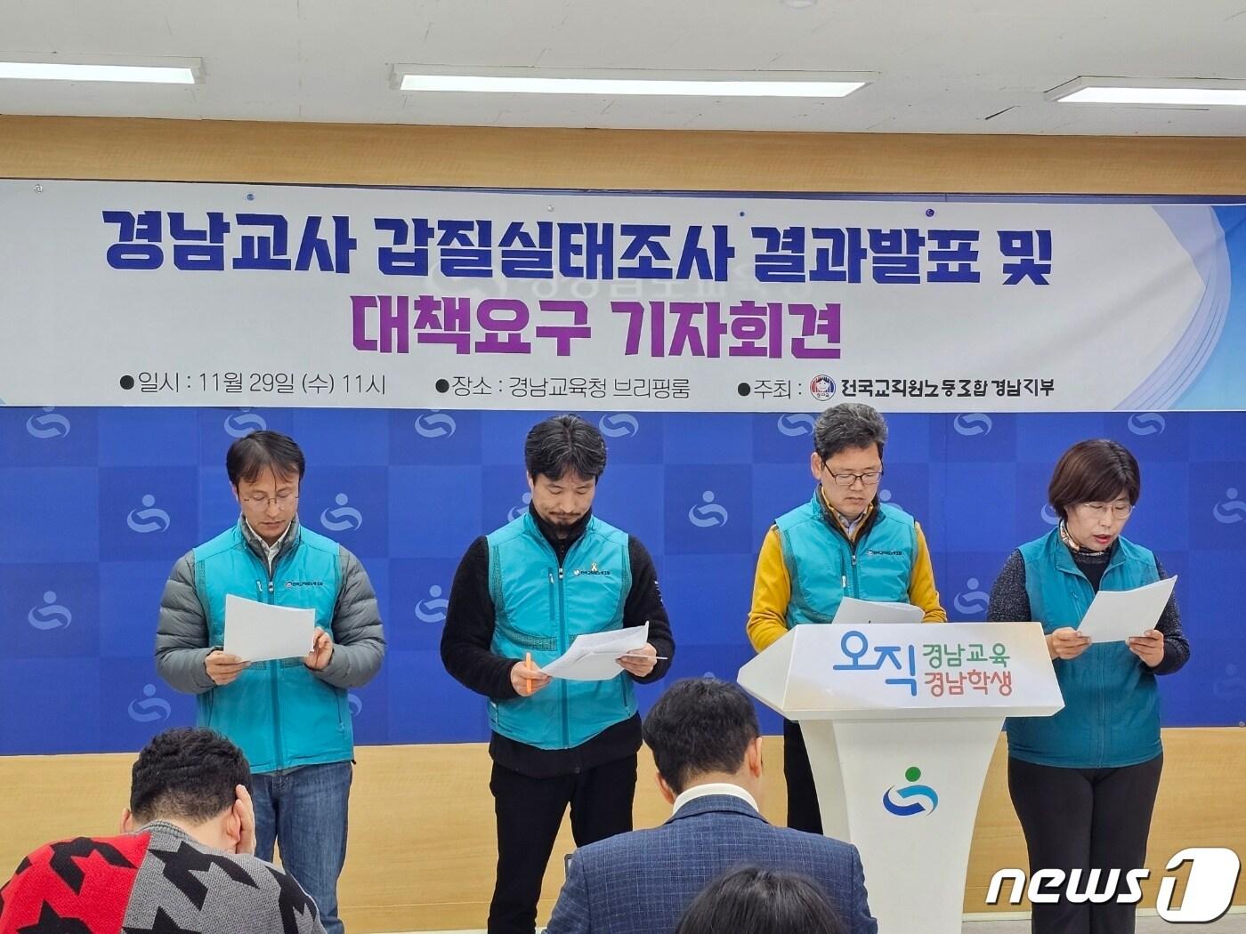 경남교사 1029명 응답…"갑질 피해 제보 500여건 넘어"전교조 경남 "전수조사·가해자 엄벌 등 대책 마련 촉구"전교조 경남지부가 29일 경남교육청 브리핑룸에서 기자회견을 열고 경남교사 갑질 실태조사 결과를 발표하고 있다. 2023.11.29 ⓒ 뉴스1 박민석 기자관련 키워드경남교육청전국교직원노동조합 경남지부전교조 경남지부경남교사교사 갑질갑질 피해성희롱폭언관련 기사경남 교사들, '학생 맞춤 통합지원' 내년 전면 시행에 "유보·재검토해야"'중학교 교장이 여교사 성추행'…창원시민 9569명 "엄벌 촉구" 탄원"팔짱 껴라, 방 잡고 놀자"…50대 중학교 교장, 20대 여교사 성추행전교조, 초교·유치원 앞 '소녀상 철거' 집회 엄정대응 촉구짧은 치마 입고 "내 골반 흔들려, 선택해 줘요" 야릇…이게 교육청 영상?