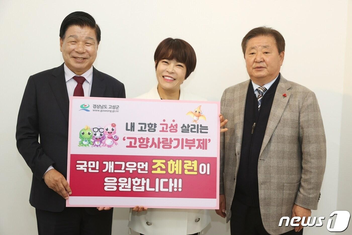 12일 개그우먼 조혜련(가운데)이 경남 고성군을 방문해 고향사랑기부금을 전달하고 있다.(고성군 제공)