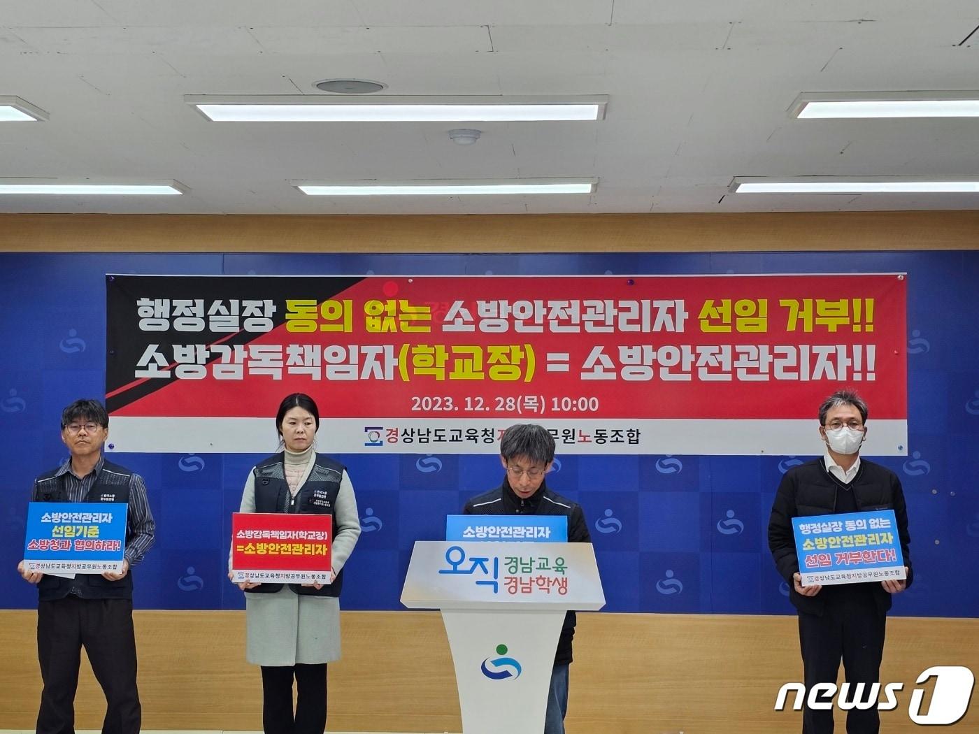 "소방감독책임자와 소방안전관리자 일원화 해야"경남교육청지방공무원노동조합이 28일 도교육청 브리핑룸에서 기자회견을 열고 "행정실잘 동의 없는 학교 소방안전관리자 선임에 반대한다"고 밝히고 있다. 2023.12.28 ⓒ 뉴스1 박민석 기자관련 키워드경남교육청경남교육청지방공무원노동조합경남김해 영운초등학교김해 초등생 방화셔터 끼임소방안전관리자학교 행정실장