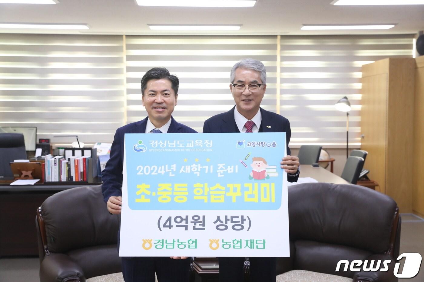 조근수 경남농협 본부장(왼쪽)이 15일 경남교육청을 찾아 박종훈 교육감에게 도내 농촌지역 초·중등 학생 학습꾸러미 지원금을 전달하고 기념촬영을 하고 있다.(경남교육청 제공)