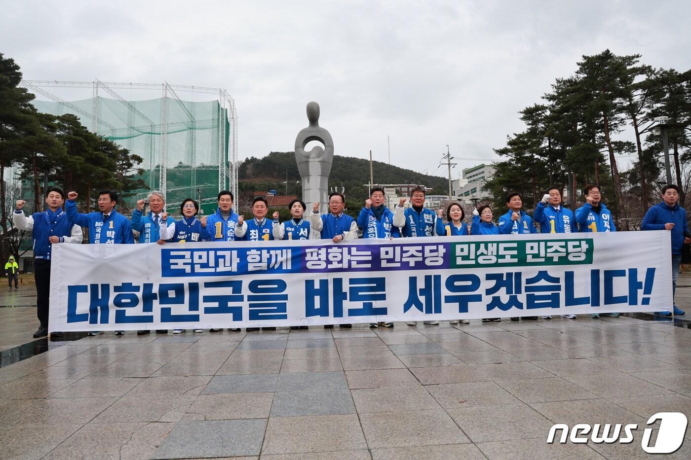 28일 오전 더불어민주당 부산 국회의원 후보자들이 남구 유엔기념공원에서 출정식과 기자회견을 갖고 있다. ( 민주당 부산시당 제공)