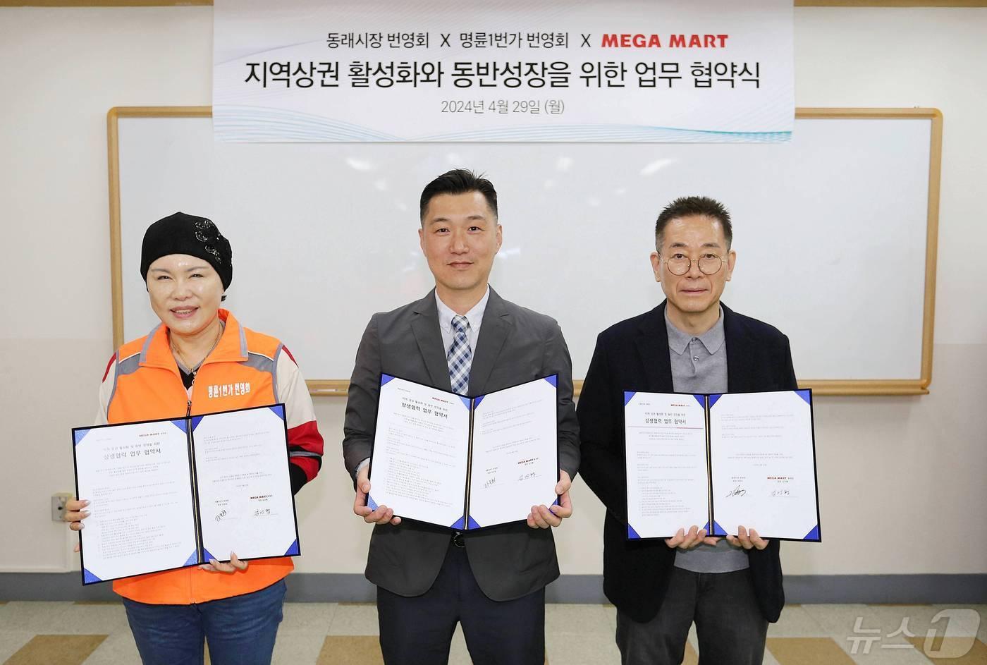 메가마트는 29일 부산 동래구 메가마트 동래점에서 전통시장 '동래시장 번영회'와 지역 인기 상권인 '명륜1번가 번영회'와 함께 지역 상권 활성화와 동반성장을 위한 상생협력 업무 협약식을 가졌다