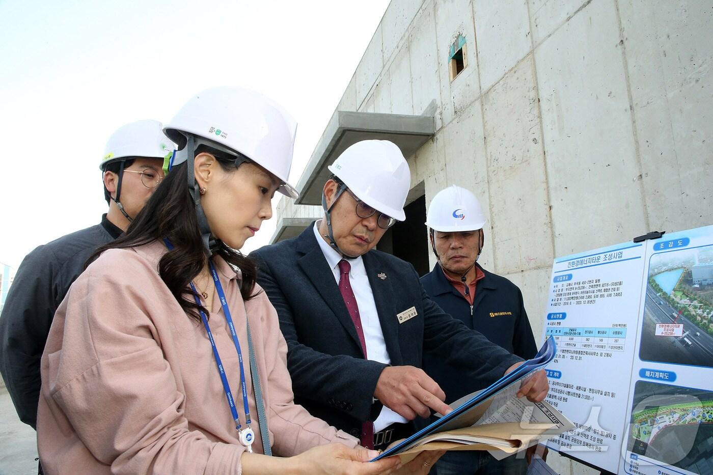 홍태용 김해시장이 친환경에너지타운 건설현장을 찾아 관계자들과 이야기를 나누고 있다.(김해시 제공)