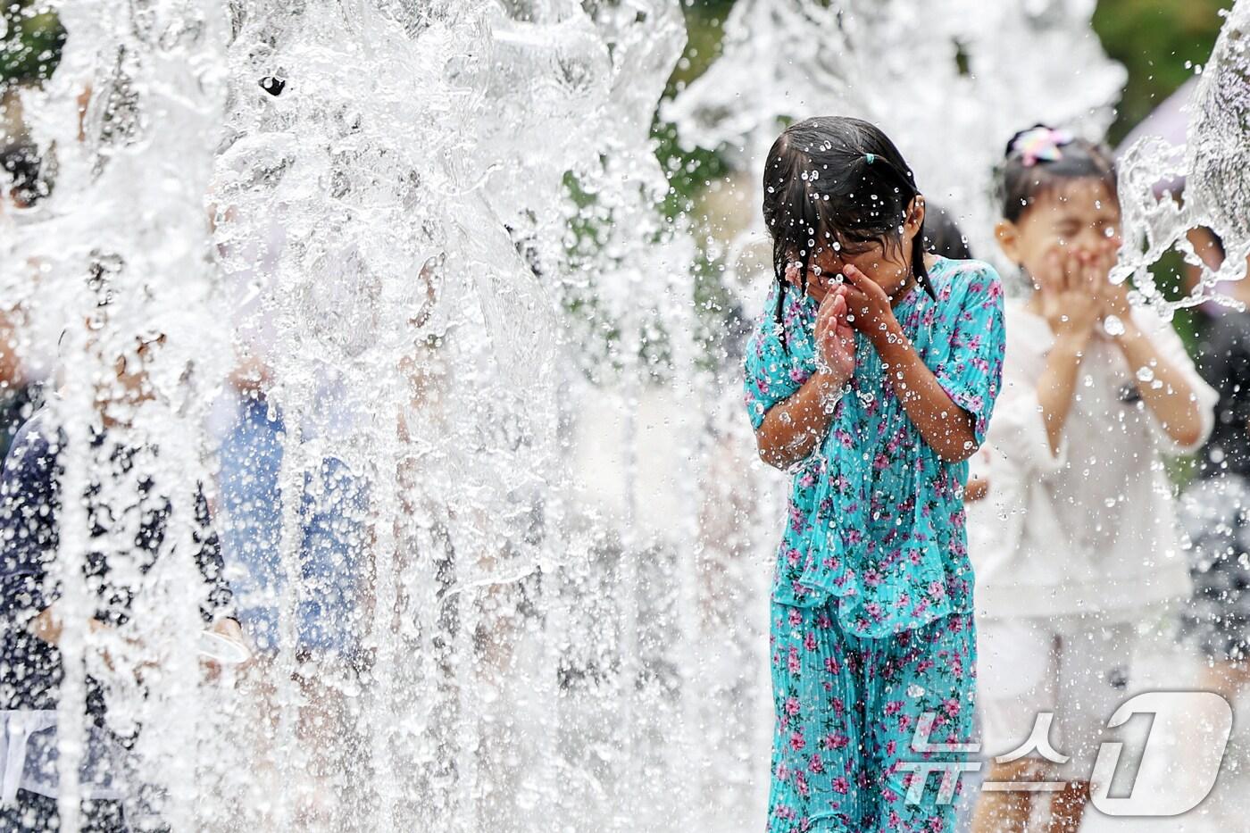 서울 종로구 광화문광장 분수대에서 어린이들이 물놀이를 하며 더위를 식히고 있다. 2024.8.25/뉴스1 ⓒ News1 민경석 기자