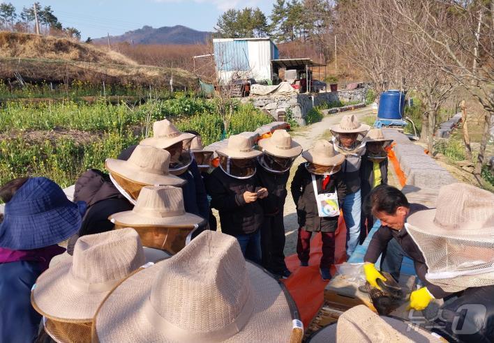 부산시 농업기술센터의 양봉 과정 교육 참가자들이 꿀벌 현장 실습을 하고 있다.(부산시 농업기술센터 제공. 재판매 및 DB 금지)
