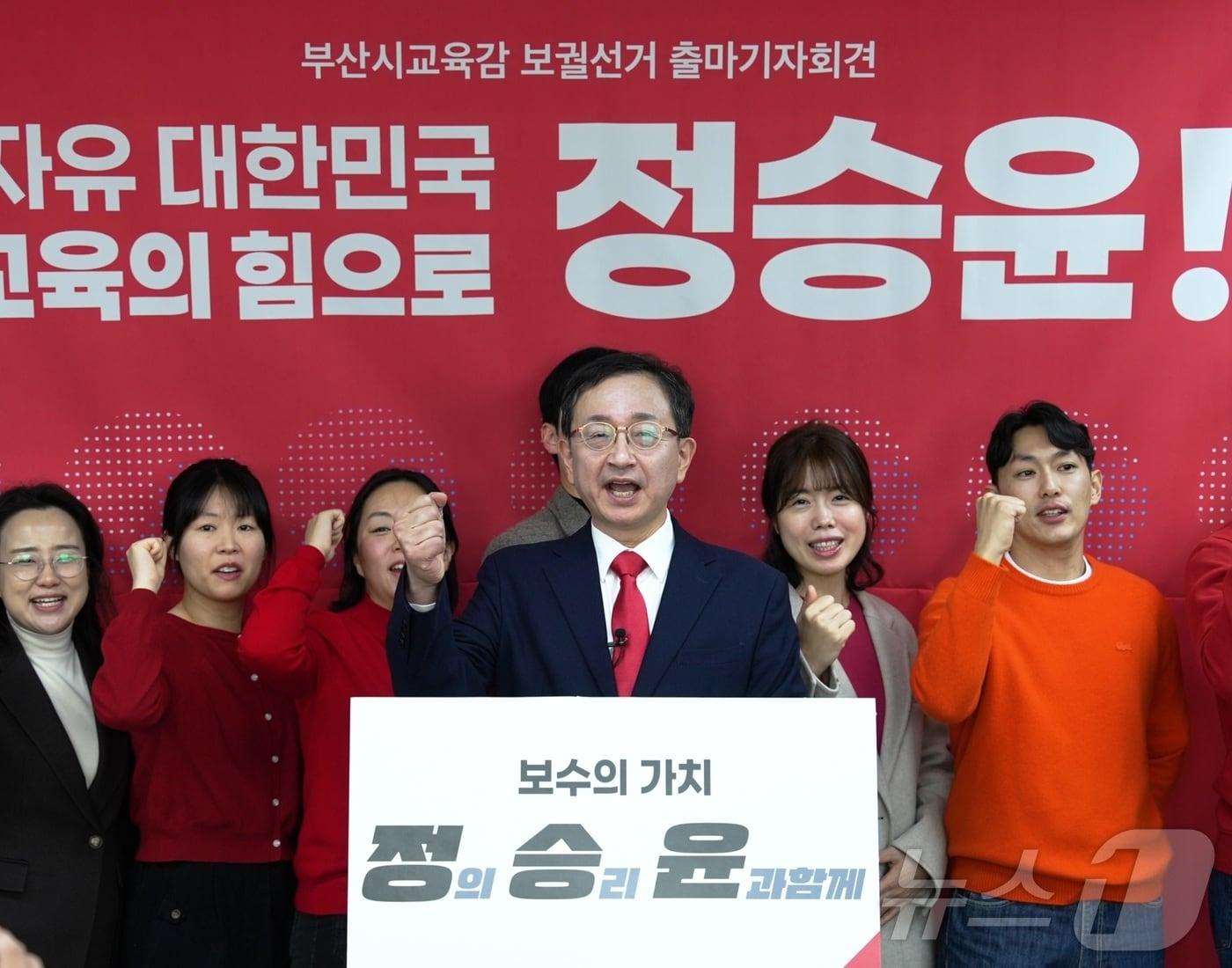 경제 교육, 글로벌 인재교육 등 5가지 공약 제시정승윤 부산교육감 예비후보가 17일 오전 부산시교육청에서 출마기자회견을 열고 발언하고 있다.2025.2.17(정 예비후보 캠프 제공. 재판매 및 DB금지)/ 뉴스1관련 키워드정승윤부산교육감재선거조아서관련 기사'선거운동에 확성장치 이용' 정승윤 부산대 교수 첫 재판서 혐의 부인부산 교육감 후보들·현직 구청장 줄줄이 '재판행'…내년 선거 '변수'한동훈 "손현보 목사 구속 지나치다…권력 마음 읽으면 안돼"4·2 재보선, 국힘의 현실 부정…"민심 바로미터 아니다"부산교육감 재선거, 보수분열로 진보 김석준 후보 16개 구군 '싹쓸이'