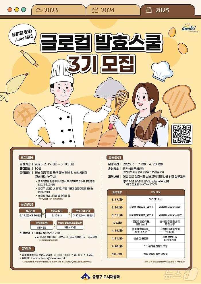 3월 10일까지부산 금정구 글로벌 발효스쿨 안내 포스터.(금정구 제공. 재판매 및 DB 금지)관련 키워드부산금정발효창업자문글로컬발효스쿨장광일 기자 '겨우 잠들었는데 강아지 짖는 소리가…' 흉기 들고 이웃 찾아간 50대부산 연산동서 트럭이 전신주 충격해 인근 정전…한전 복구 중관련 기사부산중부 건조주의보→건조경보 격상부산 중부·서부 한파주의보 해제[오늘의 날씨] 부산·경남(18일, 화)…최저 -2도, 체감온도 뚝부산 중부·서부 한파주의보부산 금정구 다문화 축제 '글로컬 문화 인 남산 페스티벌' 개최