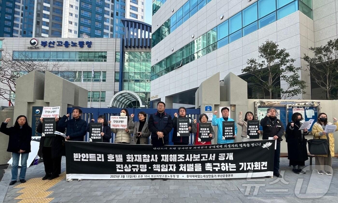 부산노동단체와 반얀트리 사고 사망자 유족들이 13일 오전 부산노동청 앞에서 반얀트리 화재 조사 결과 공개를 촉구하는 기자회견을 하고 있다. ⓒ News1 장광일 기자관련 키워드부산반얀트리노동청경찰조사결과기자회견유족노동단체장광일 기자 '겨우 잠들었는데 강아지 짖는 소리가…' 흉기 들고 이웃 찾아간 50대부산 연산동서 트럭이 전신주 충격해 인근 정전…한전 복구 중관련 기사부산 반얀트리 신축 공사장 화재 후 11개월…공사 재개 언제?'부산 반얀트리' 비리실태 보니…미완공 건물 뇌물 통해 사용승인부산 노동청, 건설현장 감독·점검에 드론 투입'부산 반얀트리 화재' 삼정기업 대표 등 6명 구속…내주 송치 예정'6명 사망 참사' 부산 반얀트리 화재 후 두달…수사 결과는?