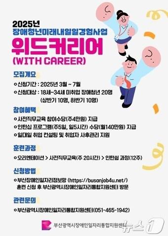 일자리지원센터 등과 업무협약부산시, 장애인 일 경험 사업 홍보물(부산시청 제공, 재판매 및 DB 금지)관련 키워드장애인취업지원부산시퍼스트인코리아고용노동부관련 기사부산시 '신중년 일자리' 예산 2배 늘려 600명 채용부산 강서구, 내년 장애인 일자리 사업 참여자 모집…총 74명부산시, '전국 지방자치단체 일자리대상' 광역 대상 수상[단독] 매출 1조 에르메스코리아, 3년째 장애인 고용 '0명'…법정의무 외면한 민간부산시-부산교육청, 2025 부산 장애인 진로·취업 박람회