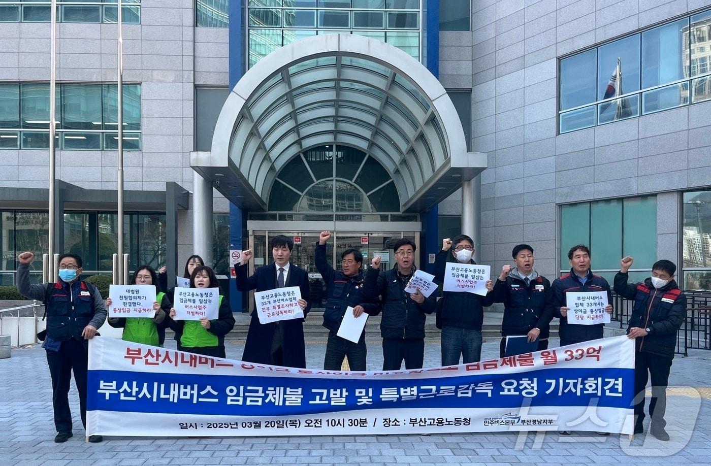 공공운수노조 민주버스본부 부산경남지부가 20일 오전 부산노동청 앞에서 버스업체 대상 근로감독을 촉구하는 기자회견을 하고 있다.2025.3.20/뉴스1 ⓒ News1 장광일 기자관련 키워드부산버스통상임금상여금대법원노동청근로감독시내버스장광일 기자 '겨우 잠들었는데 강아지 짖는 소리가…' 흉기 들고 이웃 찾아간 50대부산 연산동서 트럭이 전신주 충격해 인근 정전…한전 복구 중관련 기사서울시 "버스 파업 깊은 유감…합리적 제시에도 노조 거부"(종합)서울 버스 올해 세번째 파업 예고…'통상임금 갈등' 해 넘길 듯서울 시내버스, 10%대 임금 인상안도 결렬…노조 "1월 13일 파업 돌입"영세사업장 많은 부산 임금체불 증가…전년비 7.6% 증가부산시민단체 "시내버스 준공영제, 재정 건선성 확보 촉구"