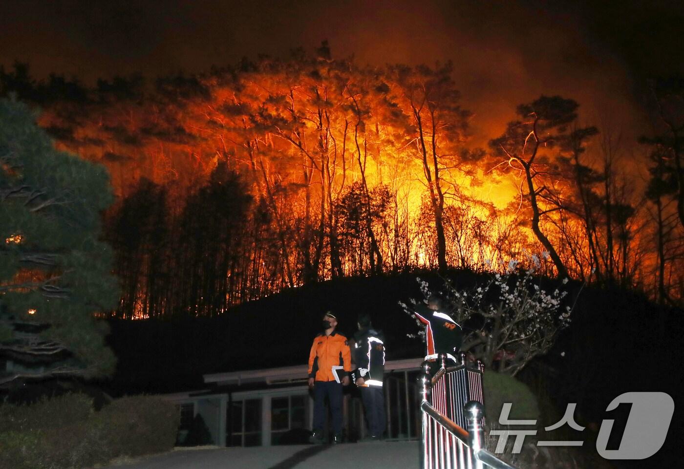 경남 산청 대형 산불 닷새째인 25일 오후 산청군 시천면 일대에서 민가 뒤로 불길이 치솟고 있다. 2025.3.25/뉴스1 ⓒ News1 윤일지 기자