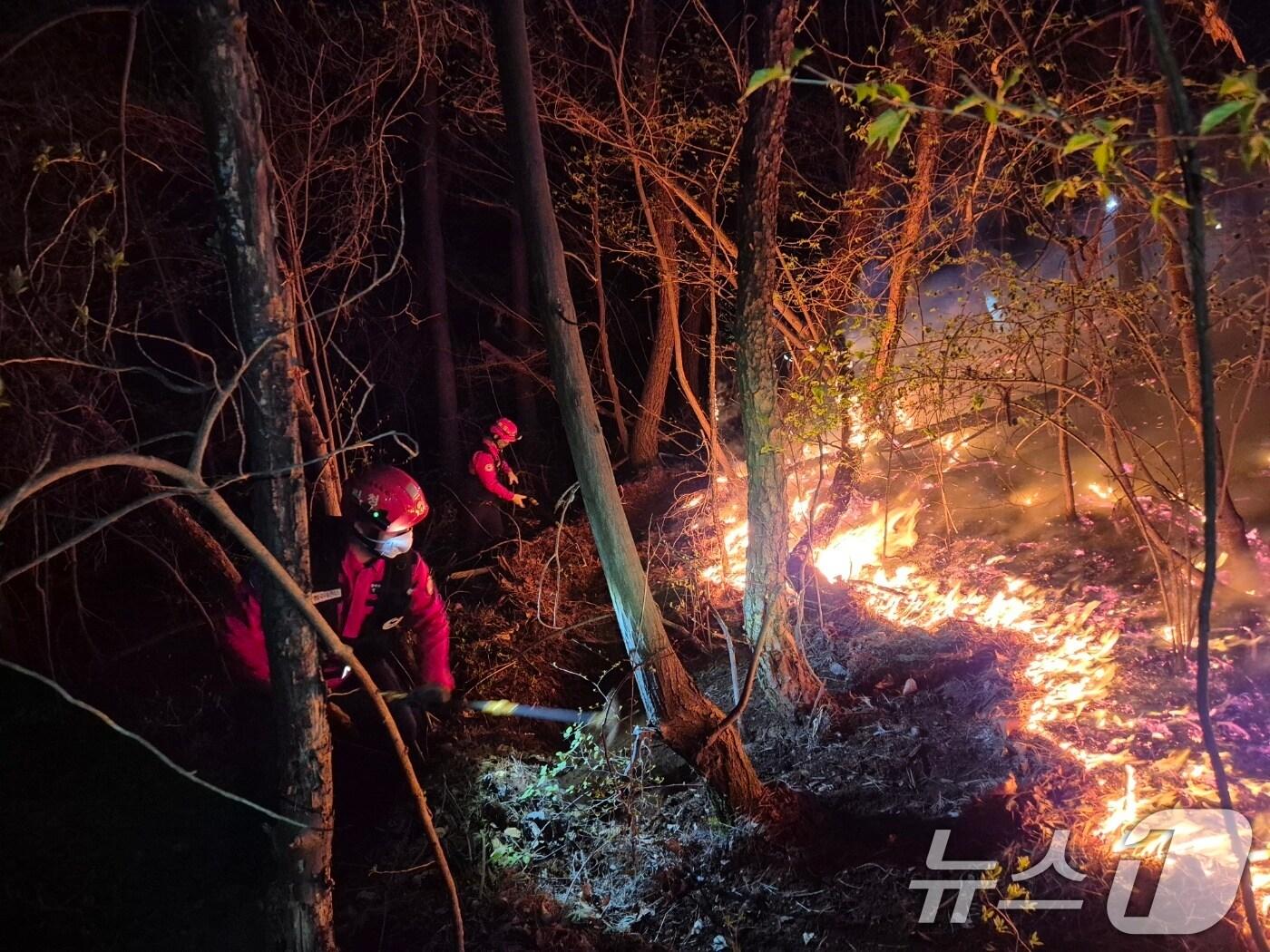 7일 산불이 발생한 경상남도 하동군 옥종면 회신리 산2 일원에서 산불진화대원들이 진화 작업을 이어가고 있다. (산림청 제공. 재판매 및 DB금지) 2025.4.7/뉴스1관련 키워드부산시의회산불모금대형산불