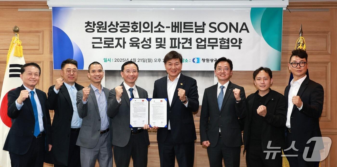 21일 창원상의에서 열린 협약식에서 창원상의와 SONA 관계자들이 기념사진을 촬영하고 있다.(창원상의 제공. 재판매 및 DB금지)
