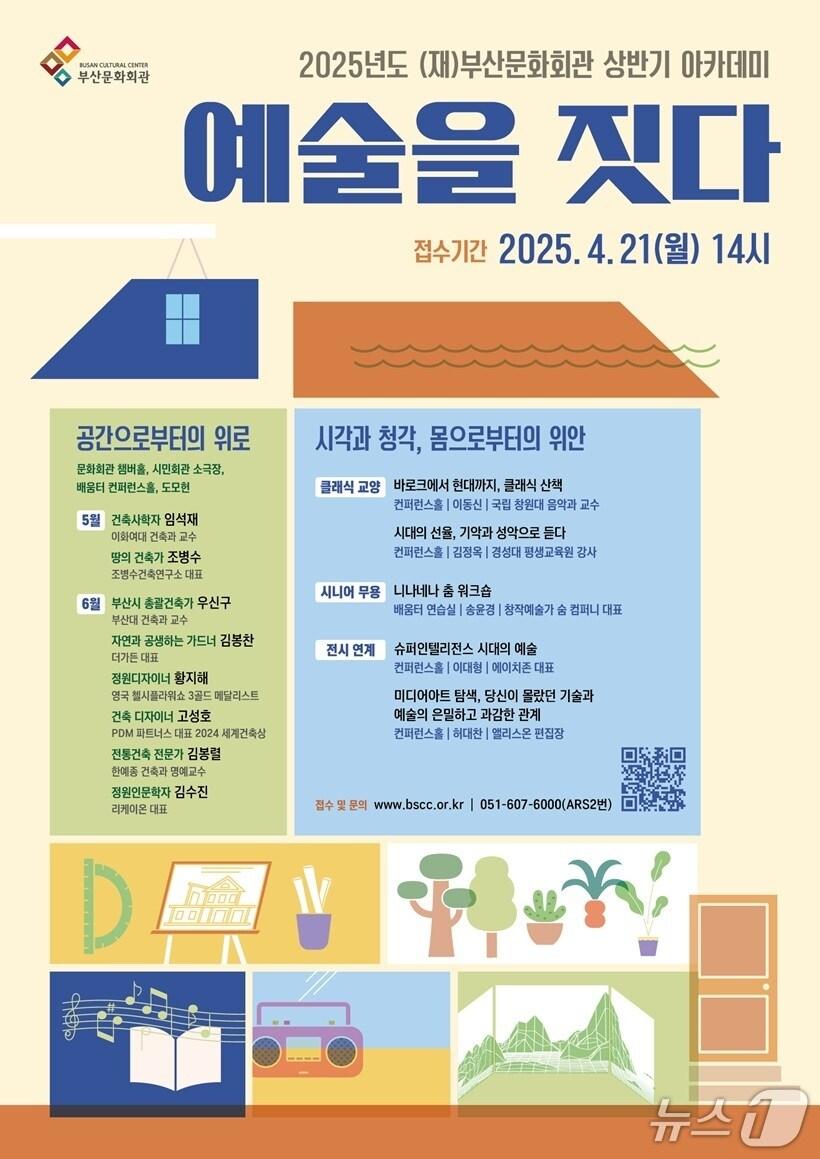 건축·예술 관련 13개 강좌부산문화회관 2025 상반기 아카데미 '예술을 짓다' 안내 포스터.(부산문화회관 제공. 재판매 및 DB 금지)관련 키워드부산부산문화회관아카데미강좌예술을짓다장광일 기자 부산진구, 28일까지 '불법 명함형 전단지' 수거 보상 사업 참여자 모집신세계 센텀시티, 22일까지 '베이비 웰컴 위크' 진행관련 기사'빌리 엘리어트·프로즌·센과 치히로'…새해 달굴 대작 공연 온다 [신년특집-공연]부산시교육청, '토요아카데미 4기 중급과정' 2회 운영'웹툰부터 유튜브까지…' 부산학생교육문화회관 '토요아카데미' 운영제13회 부산국제코미디페스티벌 29일 벡스코서 개막부산문화회관, 9월부터 예술 아카데미 '나는 예술가다' 운영