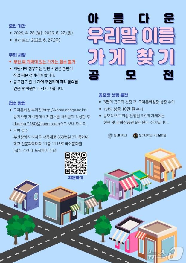 접수 28일부터 6월 22일까지동아대 국어문화원 '2025년 아름다운 우리말 이름 가게 찾기 공모전' 포스터. (동아대 제공. 재판매 및 DB 금지)윤일지 기자 권중천 희창물산 회장, 신라대에 발전기금 1억원 기부성영진 청학가족 회장, 동아대에 발전기금 2억원 기부