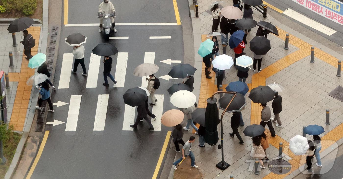 전국 대부분 지역에 비가 내린 9일 오후 서울 종로구 종각역 인근에서 우산을 쓴 시민들이 발걸음을 옮기고 있다. 2025.5.9/뉴스1 ⓒ News1 김진환 기자