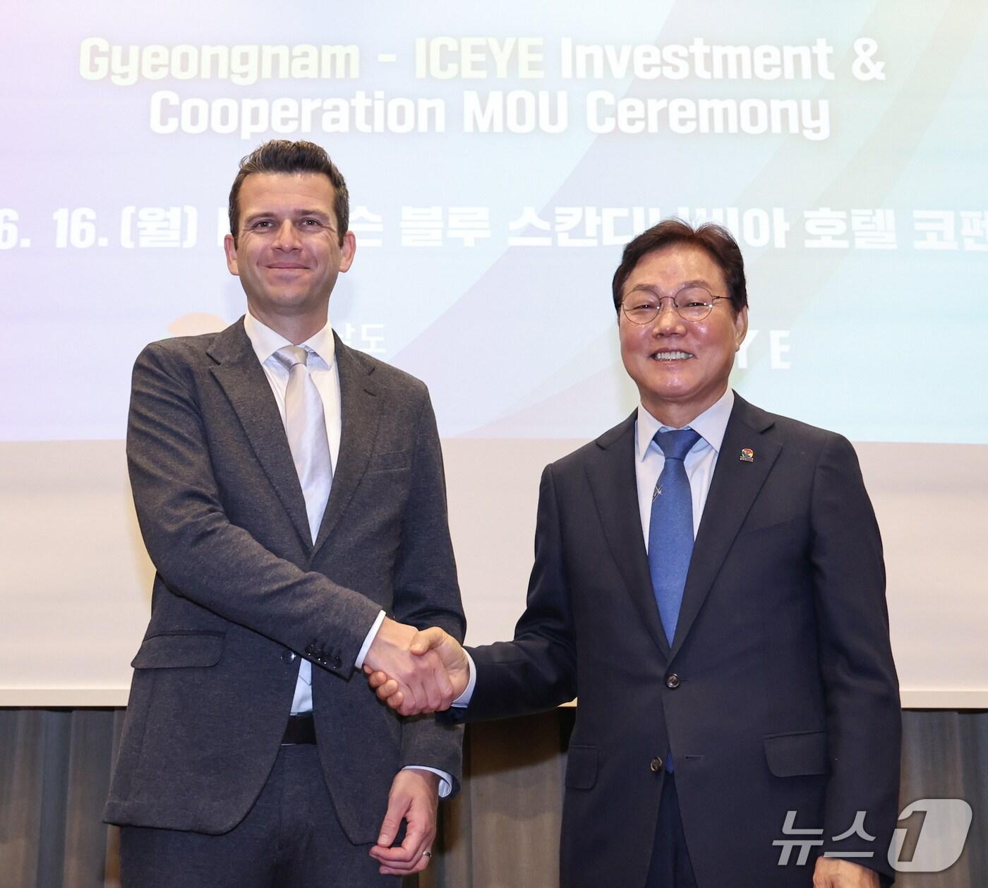 위성 데이터 활용·미래 인재 양성 등 협력키로박완수 "경남 우주항공산업 세계로 뻗어갈 것"박완수 경남지사(오른쪽)가 16일(현지 시각) 덴마크 코펜하겐 한 호텔에서 핀란드의 글로벌 소형 합성개구레이더(SAR) 위성 기업인 ‘아이스아이(ICEYE)’ 관계자와 투자유치 협약을 체결한 뒤 기념사진을 촬영하고 있다.(경남도 제공. 재판매 및 DB금지)관련 키워드박완수경남도유럽핀란드위성기업투자유치협약강정태 기자 "팔룡터널은 창원시 통합의 불이익…정부 재정 지원해야"창원시의회 "국가보안법 폐지 반대" 대정부 건의안 채택관련 기사LG전자, 500억 투자…차세대 HVAC R&D 거점 연구센터 창원에 설립박완수 경남지사 "도민이 정책 주체 돼야"…'도민총회' 신설 제안경남도, 프랑스 파리사무소 개소…"유럽 진출 교두보 될 것"유럽 순방 중인 박완수 경남지사, 폴란드서 해양 방산 세일즈경남도, 폴란드 포모르스키에주와 교류·협력 강화 협의서 체결