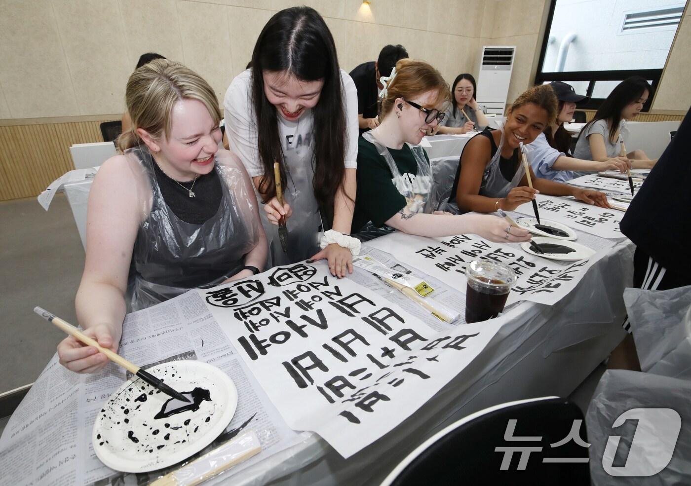 홍콩·네덜란드·영국 등 유명 대학에서 선발된 외국인 학생들이 9일 부산 금정구 부산대학교 인덕관에서 열린 '2025 부산대학교 서머 스쿨'에서 한국 전통 서예를 체험하고 있다. 내달 1일까지 진행되는 부산대 서머 스쿨에는 홍콩·네덜란드·영국·미국·벨기에 등 12개국 17개 명문대학에서 50명의 학생이 참가한다. 2025.7.9/뉴스1 ⓒ News1 윤일지 기자