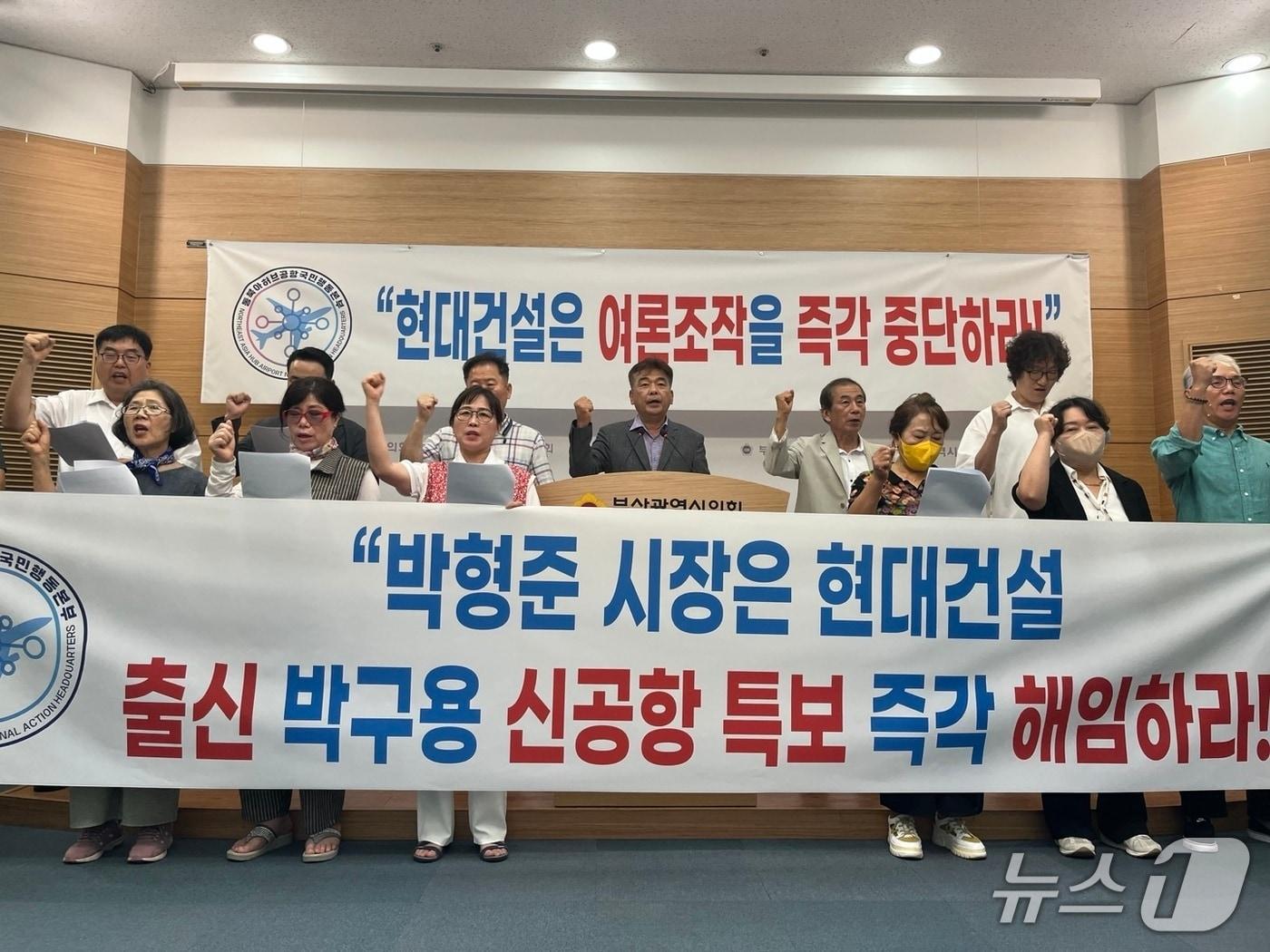 부산시민단체들이 9일 오후 부산시의회에서 가덕신공항 부지조성 공사를 포기한 현대건설을 규탄하는 기자회견을 하고 있다.2025.7.9ⓒ New1 뉴스1 장광일 기자관련 키워드부산가덕신공항현대건설부산시장광일 기자 허가 없이 장기간 공기총 소지하다 공항서 덜미…징역형 집행유예생후 5일만에 학대로 의식 잃은 '아영이'…신생아실은 '지옥'이었다관련 기사"가덕신공항 공기 연장…국토부 장관 사과·책임자 문책해야"가덕도신공항, 공기 늘려 연내 재입찰…"'관문공항' 돼야 납득할 것"가덕도신공항 부지조성공사 106개월 확정…2035년 개항 목표(종합)가덕도신공항 부지조성 106개월로 확정…개항 목표 2035년 재조정동남권 허브 '가덕도신공항' 연내 추진…사업 정상화 본격화