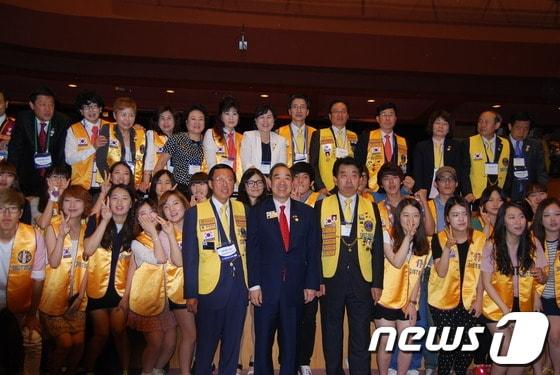 제95차 라이온스 부산세계대회가 개막된 22일 오전 부산롯데호텔에서 열린 '레오 라이온 회담'에 참가한 레오들과 윙쿤 탐 국제회장 등이 기념촬영을 하고 있다.© News1 남경문 기자