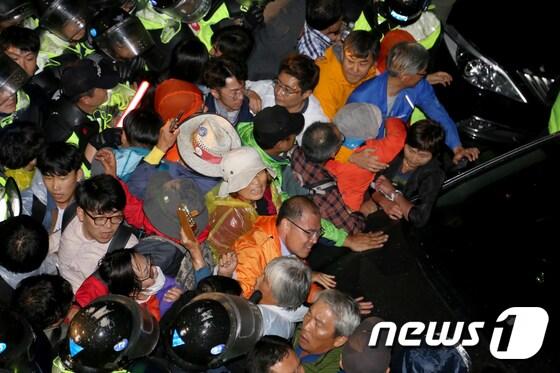 6일 오후 경북 성주군 소성리에서 사드배치반대 집회 강제해산에 들어간 경찰이 방패를 앞세워 주민들과 몸 싸움을 벌이고 있다. 2017.9.6/뉴스1 ⓒ News1 정우용 기자