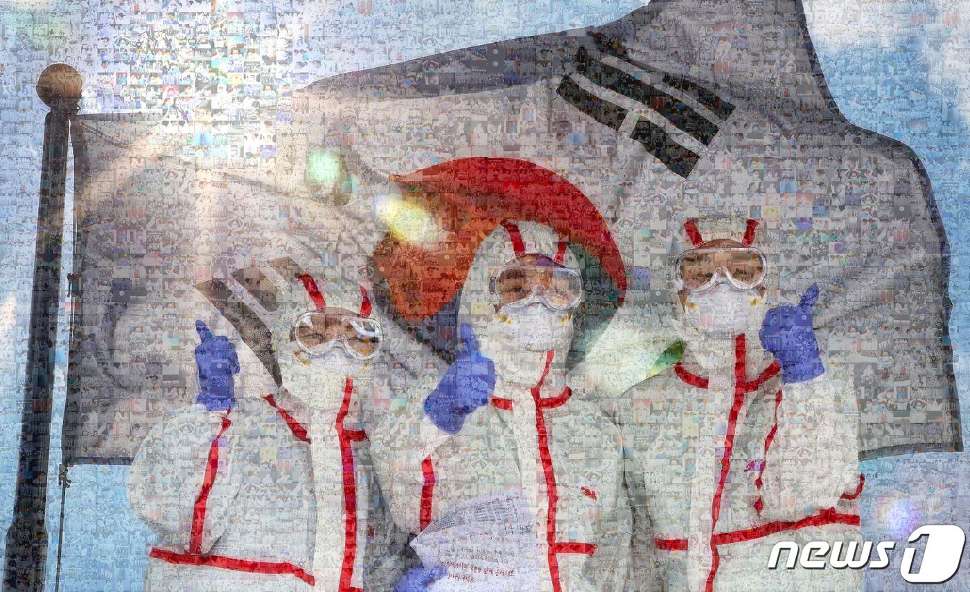 대구에서 벌어진 신종 코로나바이러스 감염증(코로나19) 70일간의 전쟁. 코로나19와 사투를 벌인 의료진과 119구급대, 자원봉사자들의 모습을 담은 현장 사진을 모자이크 프로그램을 이용해 태극기와 합성했다. 엄지를 치켜 세운 사진은 지난 2월 27일 코로나19 지역거점병원인 계명대학교 대구동산병원에서 근무교대에 들어가는 의료진이 취재진을 향해 엄지를 세워 보이는 모습. ⓒ News1 공정식 기자