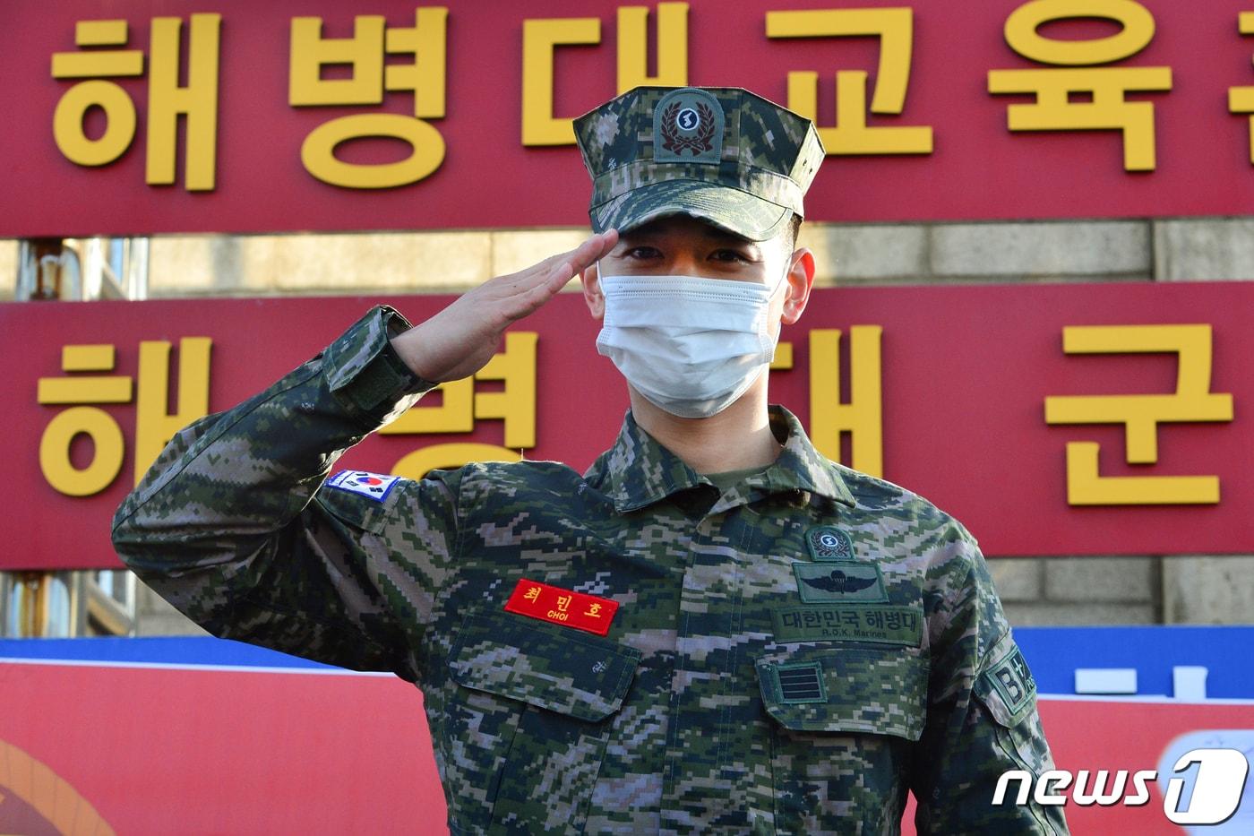 해병대 병장으로 전역한 샤이니 민호가 15일 오전 경북 포항시 남구 해병대 서문을 나서며 상관에게 경례를 하고 있다. 2020.11.15 /뉴스1 ⓒ News1 최창호 기자