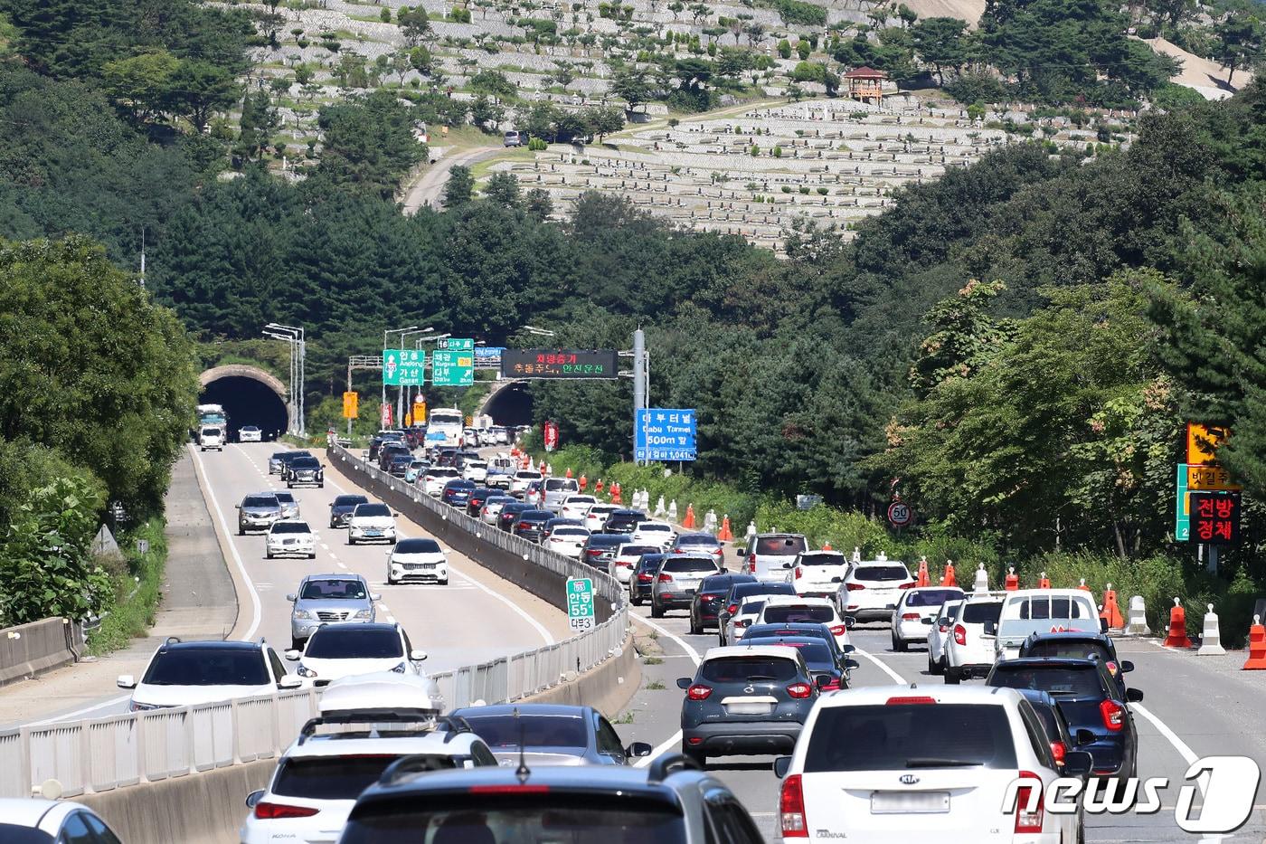 결실의 계절 가을을 맞아 9월 한달간 경북 곳곳에서 가을축제가 열린다. 사진은 추석 명절을 2주 앞둔 28일 오전 경북 칠곡군 중앙고속도로 춘천 방향 다부터널 주변이 성묘와 나들이객 차량으로 정체를 빚는 모습. (사진은 기사 내용과 무관함) 2022.8.28/뉴스1 ⓒ News1 공정식 기자