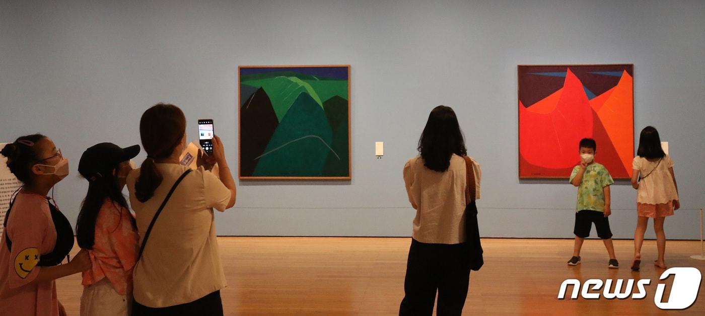 대구미술관은 21일부터 5월28일까지 이건희컬렉션 한국근현대미술 특별전 '웰컴 홈: 개화(開花)'를 연다고 19일 밝혔다. 사진은 지난 2021년 8월 관객들이 이건희 컬렉션 특별전 '웰컴 홈 : 향연饗宴'을 관람하며 'RM ZONE'에서 기념사진을 찍는 모습. 2021.8.3/뉴스1 ⓒ News1 공정식 기자
