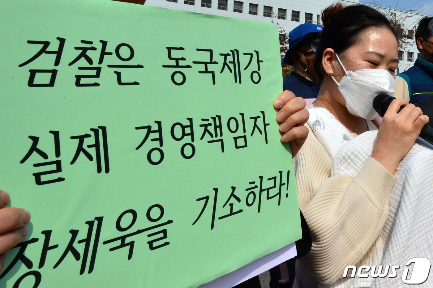 9일 오후 대구지방검찰청 포항지청 앞에서 열린 비정규직 노동자 이 모씨 산재사망사고 해결 촉구 기자회견에서 이 씨의 아내가 "지난해 3월 21일 동국제강 포항공장에서 사망한 남편의 사망 사고와 관련 최고 경영자인 장세욱 동국제강 대표이사를 중대재해처벌법으로 구속 수사할 것"을 촉구하고 있다. 2023.3.9/뉴스1 ⓒ News1 최창호 기자