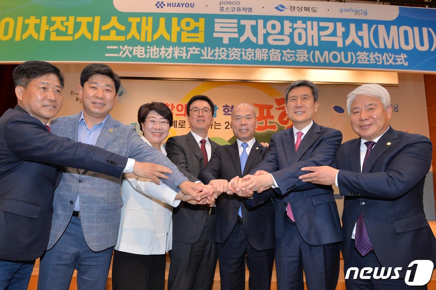천 쉬애화 중국 절강화유코발트 회장 등이 지난 3일 경북 포항시청 대회의실에서 열린 경북도, 포항시, (주)포스코퓨처엠, 중국 절강화유코발트 간 투자양해각서 체결식을 마친 후 성공적인 사업 추진을 다짐하고 있다.왼쪽부터 서석영 경북도의원, 박용선경북도의회부의장,.이달희 경북도경제부지사,김준형 포스코퓨처엠 대표이사,천 쉬애화 중국절강화유코발트회장, 이강덕 시장, 백인규포항시의장.2023.5.3/뉴스1 ⓒ News1 최창호 기자