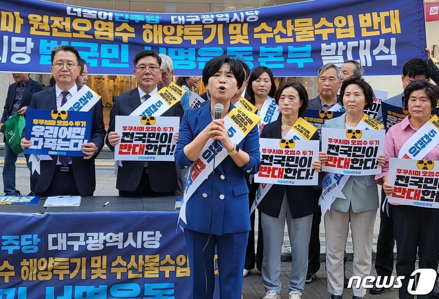 서은숙 더불어민주당 최고위원이 2일 대구 동성로에서 열린 '후쿠시마 오염수 투기·수산물 수입 반대 범국민 서명운동본부' 발대식에서 발언을 하고 있다. 2023.6.2/뉴스1 ⓒ News1 남승렬 기자