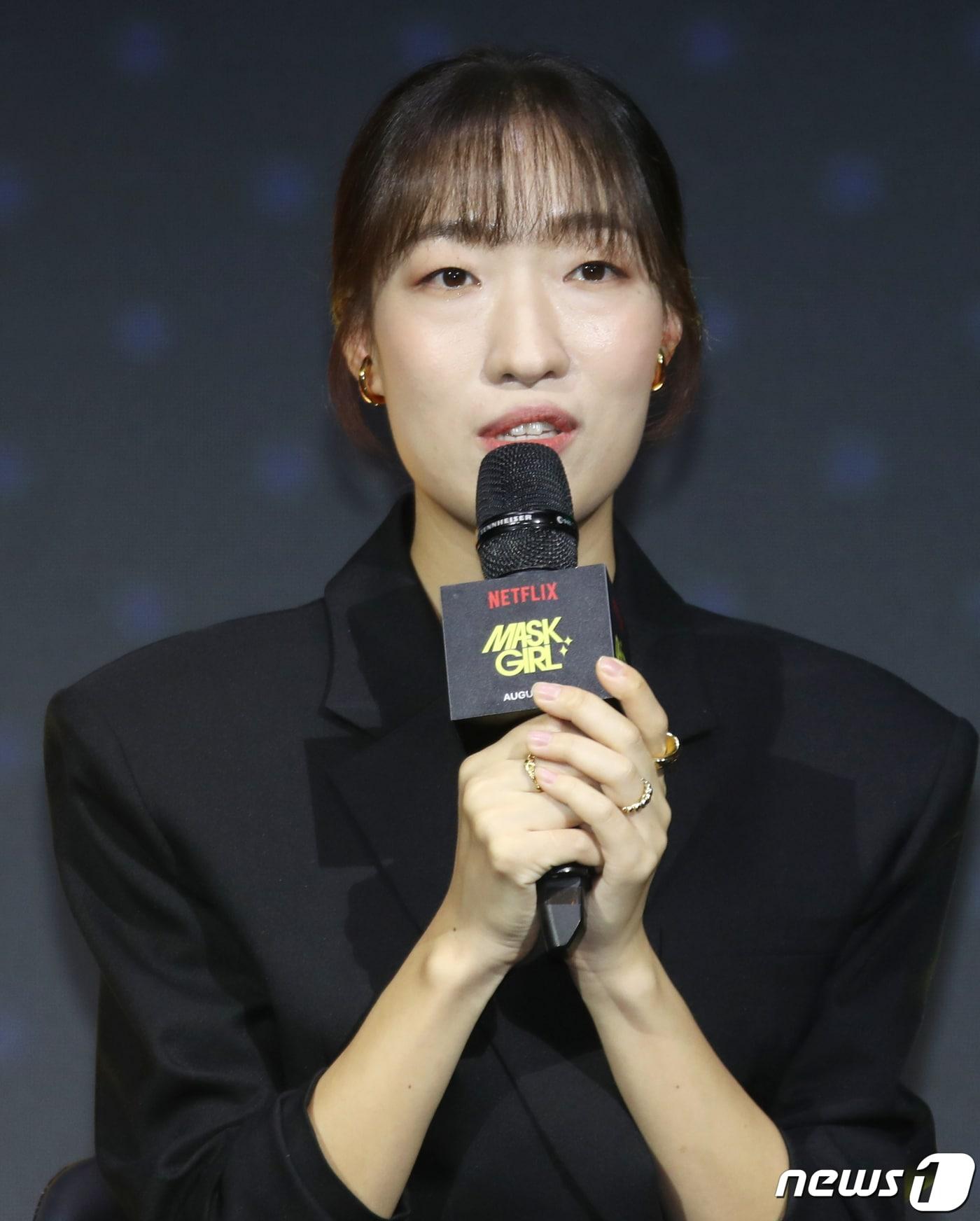 본문 이미지 - 배우 이한별이 16일 서울 종로구 JW메리어트 동대문 스퀘어 서울에서 열린 넷플릭스 오리지널 드라마 '마스크걸' 제작발표회에서 취재진 질문에 답하고 있다. 2023.8.16/뉴스1 ⓒ News1 권현진 기자
