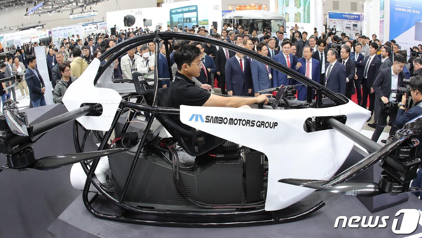 홍준표 대구시장, 이재하 삼보모터스 회장, 이상길 엑스코 사장을 비롯한 내빈과 관람객들이 19일 오전 대구 엑스코에서 개막한 '2023 대한민국 미래모빌리티 엑스포'를 찾아 삼보모터스가 세계 최초로 개발한 하이브리드 도심항공모빌리티(UAM) 모델 '미르엑스투(MIRxII)'를 살펴보고 있다. 2023.10.19/뉴스1 ⓒ News1 공정식 기자