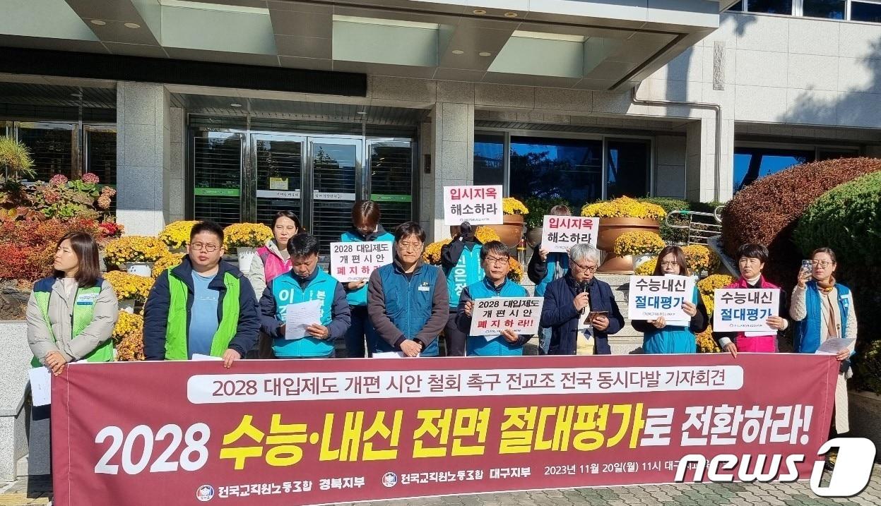 전교조 대구지부와 경북지부는 20일 대구교육청 앞에서 기자회견을 열고 "상대평가를 전 과목으로 확대하는 대입제도 개편 시안을 철회하고 내신·수능 절대평가가 실현돼야 한다"고 주장했다. (대구전교조 제공) 2023.11.20/뉴스1관련 키워드2028학년도 대학입시제도대구전교조경북전교조교육부수능남승렬 기자 경북대 이지훈 교수, 전고체전지 성능·수명 좌우 요인 규명대구시, 'AI로봇 글로벌 혁신특구' 사업 추진…10개 기업 참여
