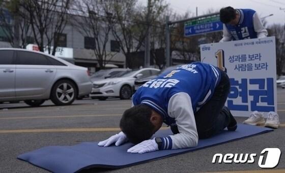 구미시을에 출마한 김현권 더불어민주당 후보가 도로가에서 큰 절을 하고 있다.(자료사진)/뉴스1관련 키워드410총선22대총선민주당.국민의힘민주당경부도당정우용 기자 성주군, 중소기업에 설 운전자금 225억 지원청도군의회 "군수 욕설·모욕적 표현으로 군민 신뢰 훼손"