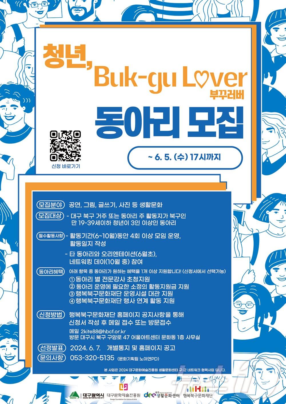 '청년, 부꾸러버' 홍보 포스터. 모집 기간은 오는 6월 5일까지다.(행복북구문화재단 제공)관련 키워드행복북구문화재단동아리이성덕 기자 대구 지하철 참사 희생자 '수목장' 갈등…접점 못 찾아'2조 피해' 의성 산불 실화자 집행유예…산림당국 손배 청구할까