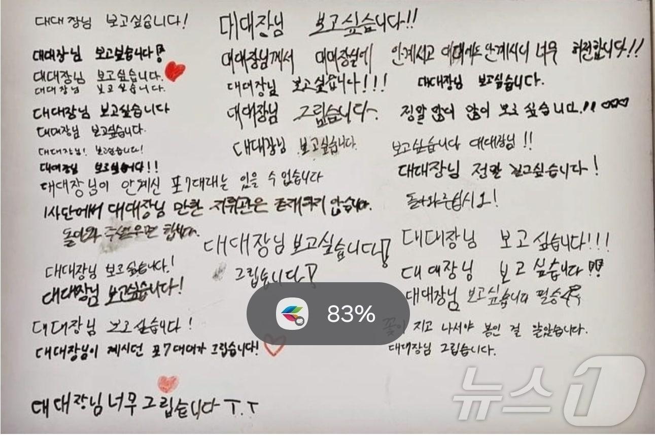 "부당한 대우와 조직 내 따돌림 즉각 중단해야"순직한 채상병의 대대장과 근무한 부대원들의 손편지(해병 학사 98기 동기회 제공)2024.5.30/뉴스1관련 키워드경상북도포항시안동시해병대1사단대대장사단장연대장신성훈 기자 경북 고령서 산불…헬기 투입 40여분 만에 진화3년간 학교 시험지 16차례 유출…40대 학부모 1심서 징역 5년관련 기사한라산엔 '첫눈'·일부 '한파주의보'…가을 강추위로 '꽁꽁'(종합)경북도민체전 폐막…포항시 종합 1위, 김천서 4일간 열전 마무리"경북 산불 현장 달려간 백의천사들…산불 이재민에 성금·의료지원"경북도, '고준위 특별법 개정' 월성 원전 계속 운전 필요설연휴 안동·영양·포항·청도 단독주택서 화재 잇따라