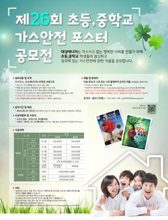 초중등 대상 관련 키워드대성에너지26회 가스안전 포스터 공모전작품 접수김종엽 기자 대구 제조기업 45% "올해 경기 둔화…경기·수요 변수"대구 아파트 입주전망지수 19.4p↑…"주택시장 회복 기대"관련 기사대성에너지, 가스안전 그림 & 포스터 공모전…9월1일까지 접수