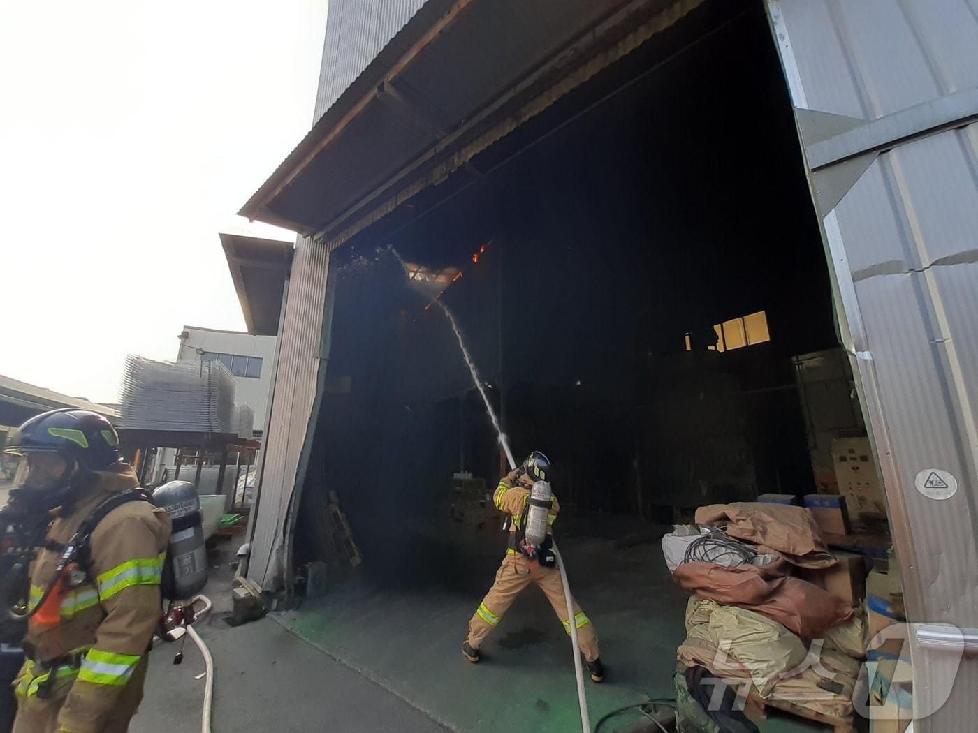 10일 오후 5시 40분쯤 경북 영천시 도남동 한 펜스 제조 공장에서 불이나 소방당국이 화재를 진화하고 있다(경북소방본부 제공)2024.6.10/뉴스1관련 키워드경상북도영천시도남공단도남동화재공장경북소방경북경찰신성훈 기자 의성 낙단보서 낚싯배 침몰…1명 사망·1명 부상(종합)안동 아파트·울진 단독주택 화재…70대 남성 1명 2도 화상