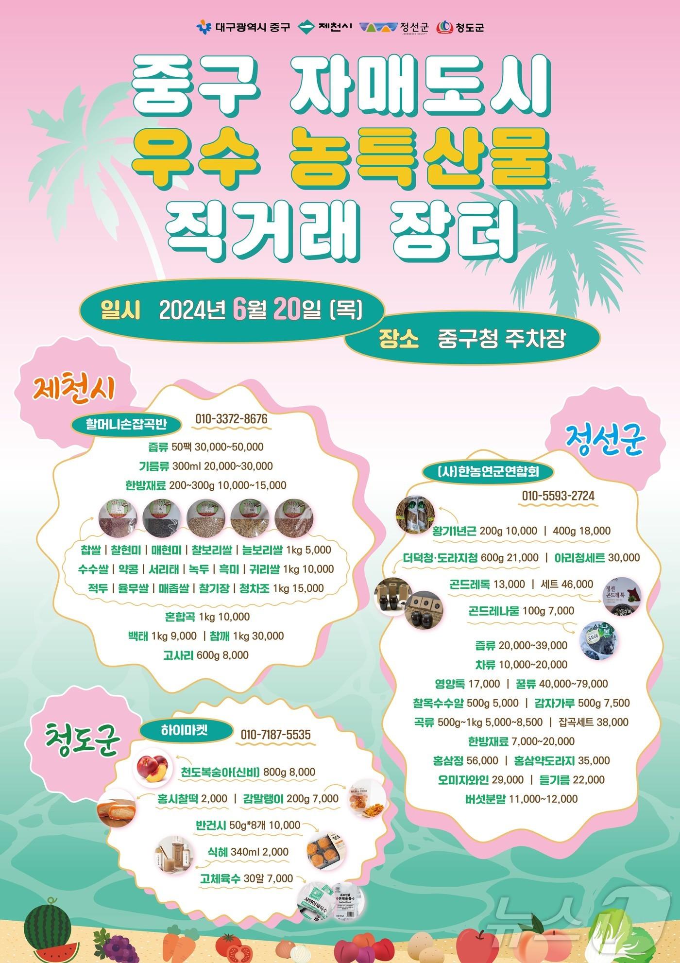 자매도시들과 연계대구 중구는 오는 20일 구청 주차장에서 자매도시와 연계해 농특산물 직거래 장터를 운영한다. (대구 중구 제공)/뉴스1관련 키워드대구 중구직거래장터농특산물자매결연남승렬 기자 작가 4인의 다층적 변주…대구 '갤러리 몬'서 '빛의 서막' 展무면허 미성년자에게 전동바이크 빌려준 업체 대표 3명 기소