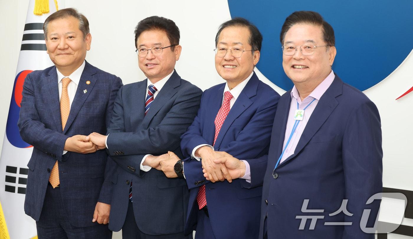 중앙 권한 이양·특례 180건 포함…내년 2월 국회 통과 목표이상민 행정안전부 장관(왼쪽)이 지난 6월4일 서울 종로구 정부서울청사에서 열린 대구·경북 통합 관련 관계기관 간담회에서 이철우 경북지사(왼쪽 두번째), 홍준표 대구시장, 우동기 지방시대위원장(오른쪽)과 기념촬영를 하고 있다.(공동취재) 2024.6.4/뉴스1 ⓒ News1 허경 기자이재춘 기자 [오늘의 날씨] 대구·경북(16일,금)…낮 최고 8~16도 '포근한 겨울'"대구 취수원, 강변여과수나 하상여과수로 취수 방식 전환 추진"