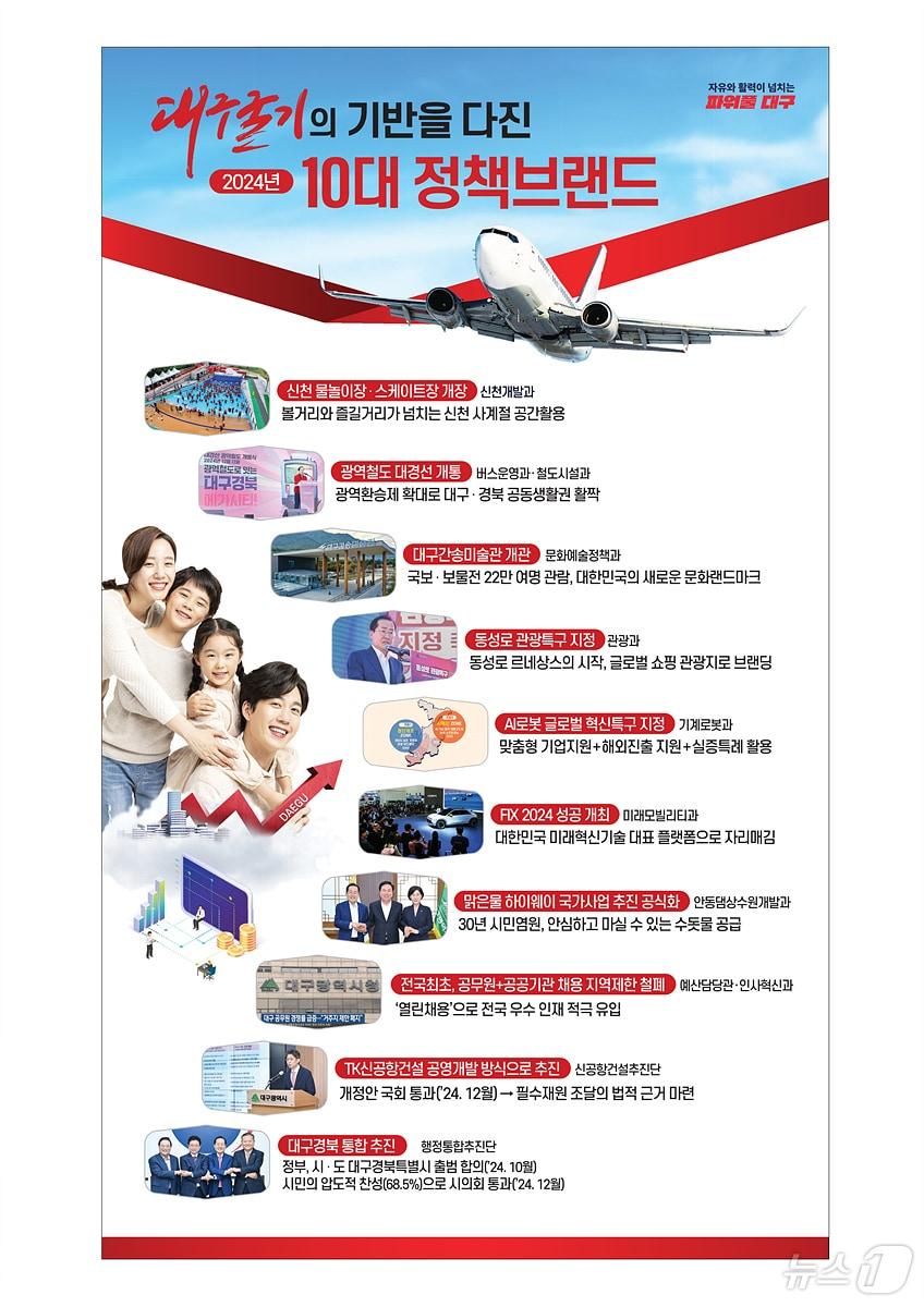 대구시는 9일 지난해 대구의 핵심사업 등에 기여한 정책을 중심으로 '대구시정 10대 정책브랜드'를 발표했다. (대구시 제공)/뉴스1관련 키워드대구시시정 10대 정책브랜드홍준표대구경북신공항대구경북 행정통합대구간송미술관남승렬 기자 대구시장 출마설 이진숙 "지금은 방미통위 설치법 헌법소원만 관심"대구 중구, 공유 주차·공한지 활용으로 주차 공간 379면 확보